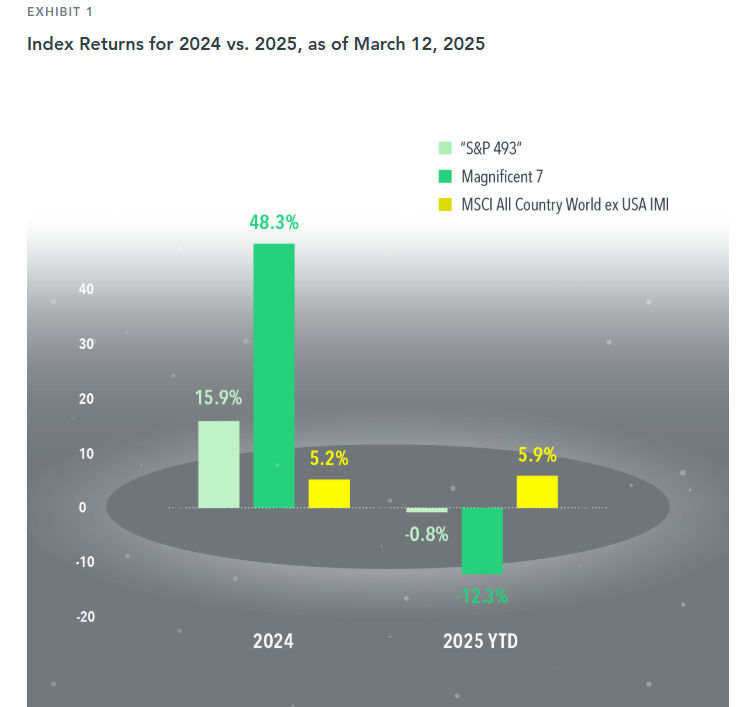 This force can pull in a positive or negative direction. In 2024, the S&P 500 returned 25.0%. This was driven heavily by the Magnificent 7, which returned 48.3%. The other 493 stocks in the index collectively returned 15.9%. This year, the opposite effect has played out: The Magnificent 7 returned –12.3% through March 12, compared to –0.8% for the “S&P 493.”